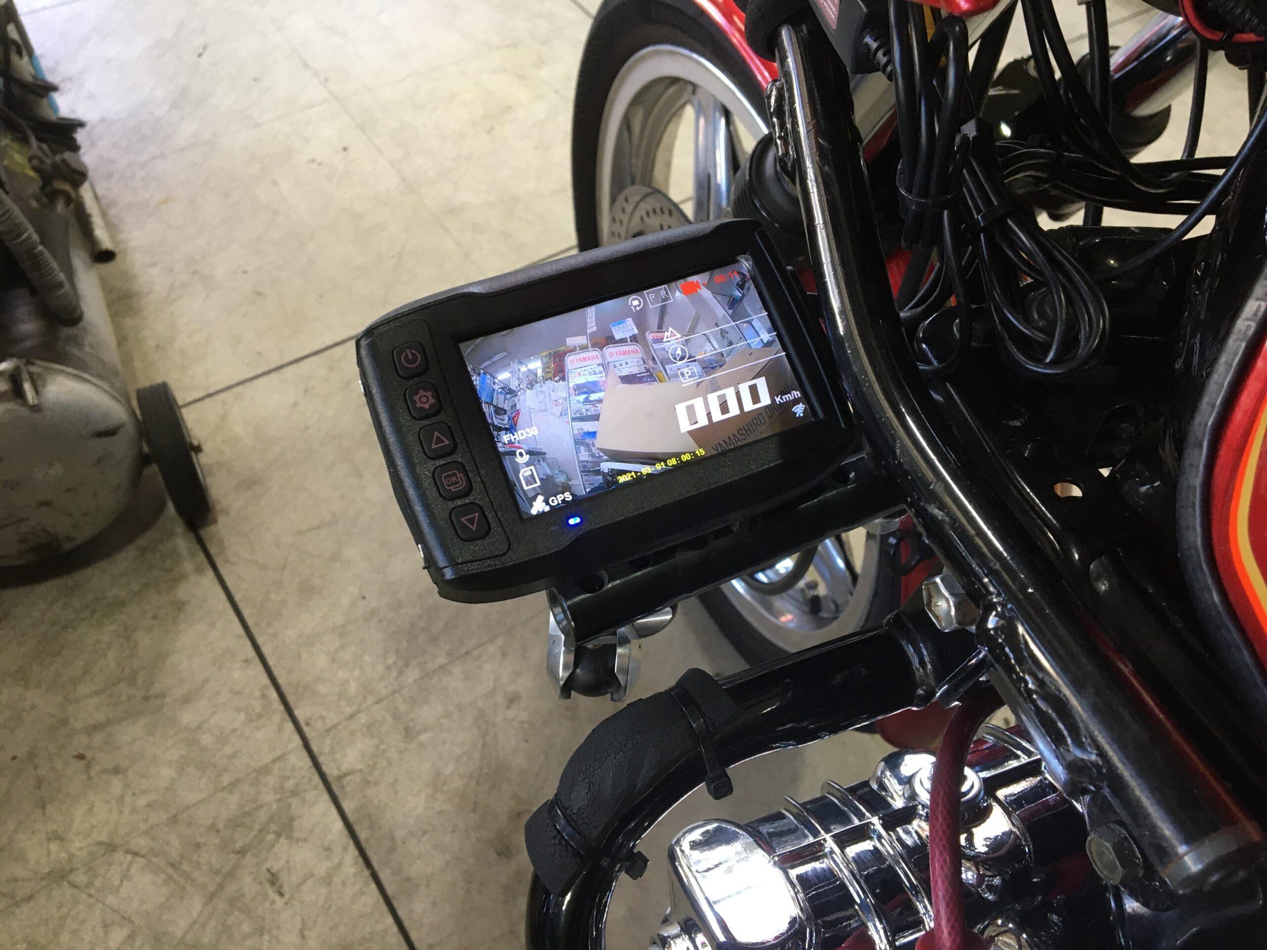 追加のメーターでドライブレコーダーをエンジンガードの上あたりに付けております。