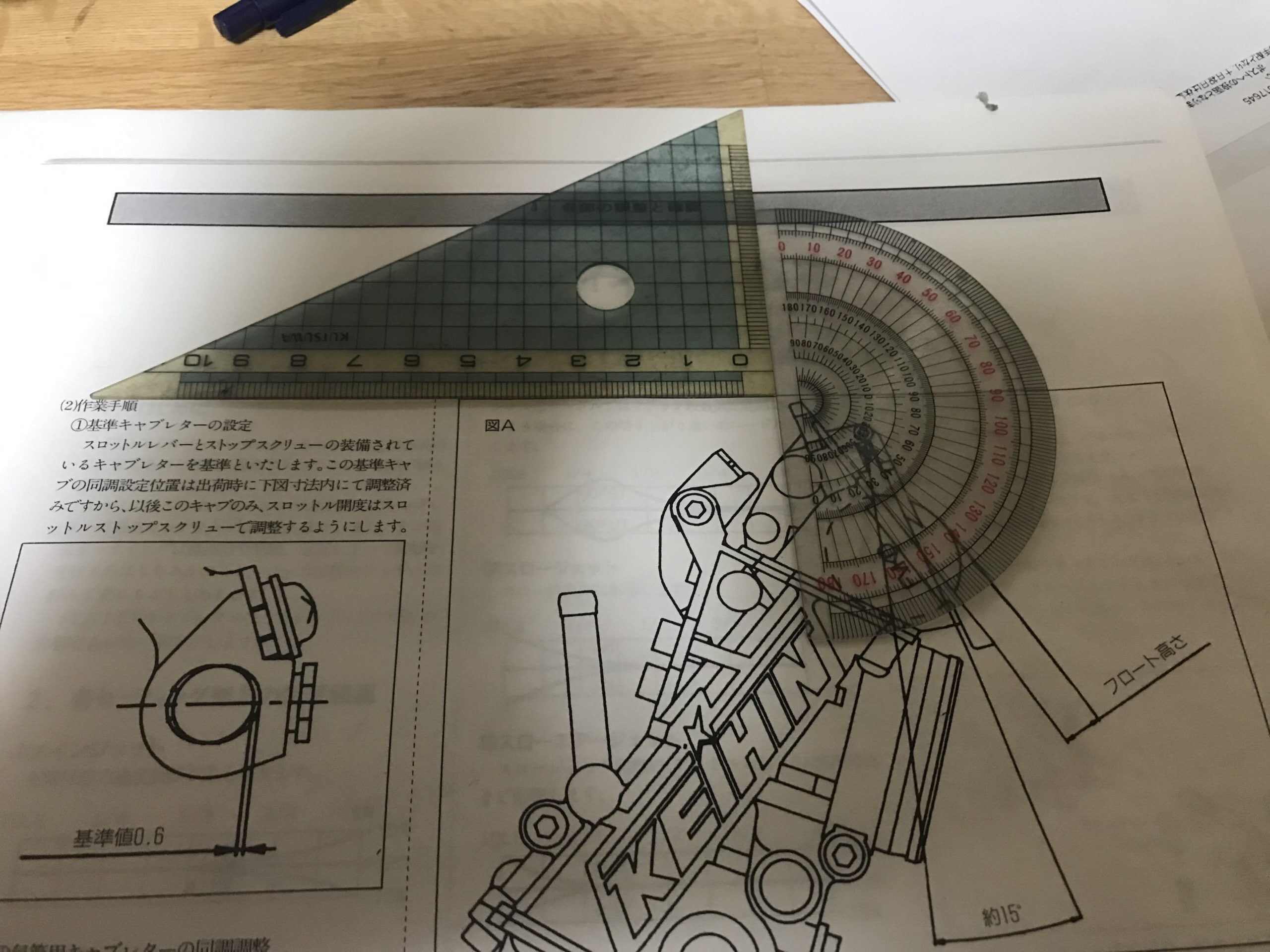 フロートチャンバーの合わせ面が30度になるようにして油面調整をしています。