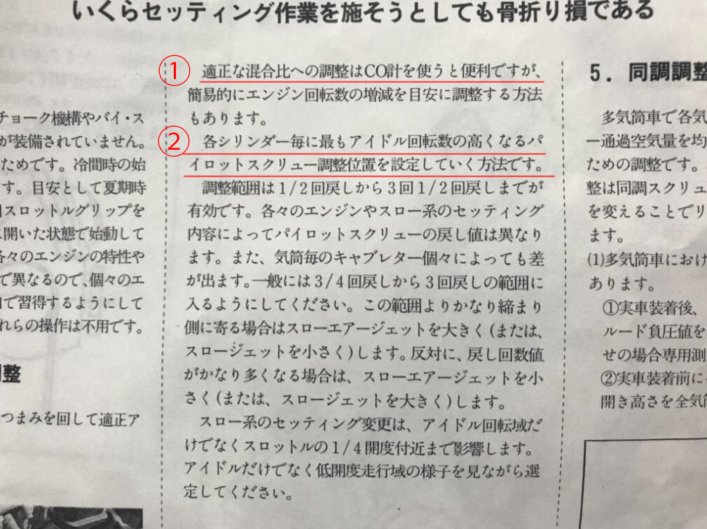 結論から書くとタイトル通りです。各シリンダーごとに適切なアイドル回転数で調整のやり方を見つけました。見つけたと言っても自分なりに見つけたので正しい方法かどうかは分かりません。