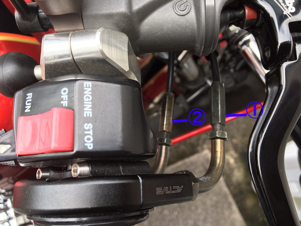 推奨はされないのですが、1本引きにしている場合の調整です。 基本的には引きと戻しの2本を前提に書いていますが、チャンスがあれば1本引きにわざとしてみるとスロットルワイヤーに対する知見が深まると思います。 青①と赤①のみで調整を行います。 戻し側のワイヤーは繋がっていればよいと上記していますし、他のブログ投稿でも書いていますが、 繋がっている時はスロットルワイヤーの張りには影響をします。 まれに1本引きにしている方もいらっしゃいますが、基本的には2本引きの方がスロットルワイヤーのトラブルに見舞われた時に生存率があがります。