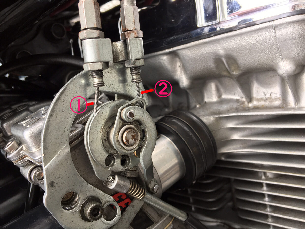 着脱した時の話になるのですけど、赤②はスロットルワイヤーの戻しになります。 必ず緩めにしておいてください。スロットルホルダー側のアジャスターで張って調整を行います。 赤①を先に緩めておくとスロットルバルブの開閉について調整が出来ません。 必ず赤②は緩めのテンションで固定してください。 2股のケーブルを使っている特殊な車輌でも同様に基準キャブ2つともテンションを緩めてください。 アジャスターを閉めてスロットルのテンションを掛けた時にどちらか片方しかテンションがかからないと思いますが戻しのワイヤーは繋がっていれば問題はありません。