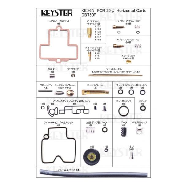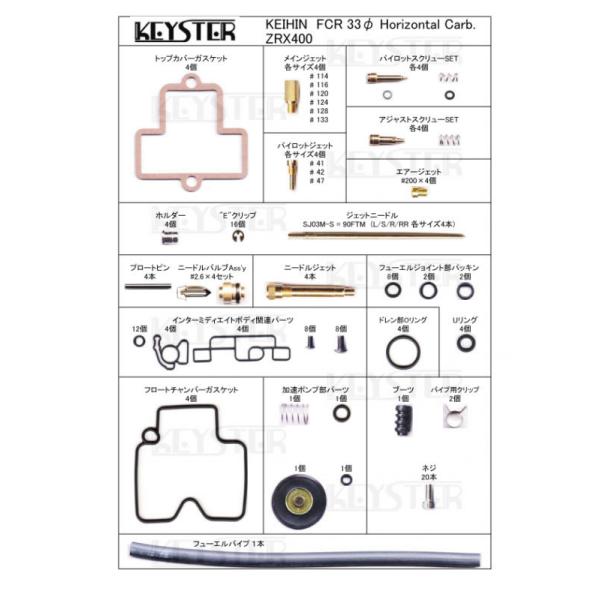 セッティングも含めて上記の内容が全て詰まっているパッケージです。 燃調キット&逆転蘇生キットを使うとボディの削れ対策が行えます。 ボディの削れ対策を含めて素晴らしい商品だと思います。 また、ジェット類もスロージェット、ジェットニードル、メインジェット一通り含まれています。 デメリットは、ジェット類が特殊番手になっているものがあるという事です。 ジェットニードルで言えばSはケイヒン純正と全く同じです。 ストレート径を基準に特殊な形状になる様子です。 下記は電話で聞いた範囲なので聞き違いなどあるかもしれません。 Lは0.01mm太く、Rは0.005㎜細く、RRは0.01mm太いという様子です。 非公式ですし、割高になる様子ですが、単品での購入も出来る様子です。 セッティングの行い方にもよるのですが、おそらく燃調キットだけで満足いくセッティングは出来ると思います。ジェット類の選定も一律で同じというわけではなくて、ちゃんと考えれている様子です。FCRのセッティングはABテストの繰り返しです。良くなったと思ったら悪くなるまで試さないとそれが本当に良いセッティングかどうか分かりません。 KEYSTARでセッティングを行うと特殊番手のジェットでセッティングを行うのでジェットニードルなどの選定でほんのちょっとだけ足りない番手が出て来るかもしれません。 しかし、確認の為のほんのちょっとです。FCRのセッティングにのめり込んで、徹底的に検証をしたい場合はKEYSTAR以外の番手も追加購入すれば事足ります。 先にKEYSTARで一通り揃えてから必要になったジェットの番手を購入するという方法もありかなと思います。結果論ですが、CBX1000にはFCR燃調キットを使っていれば良かったと思っています。 必要な番手の幅もおおむね検討はついています。 ZRX400用33パイとSR用33パイを2個買えば概ね事足りるかなと思います。 ジョイント部分の樹脂パーツやリップシールと浮動バルブが含まれていない以外はオーバーホール用のパーツは含まれています。足りない物や気になる物は別途ケイヒン純正を買い足せばよいのでこういったキットは非常にありがたい限りです。